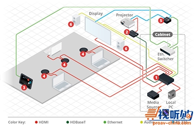 克莱默VS-62DT矩阵切换器具有极佳的灵活性和极高的性价比,可用于大型会议室的短距离和长距离输出。该设备可独立切换6路HDMI输入到HDMI输出和HDBaseT输出上,6输入VS-62DT解决方案短距离和长距离均可同步显示。
