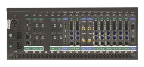 传统的模块化矩阵中的输入或输出是由机箱决定的,无法重新配置,而且都是对称式设计。这种设计决定了,一个16x16的机箱,输入或输出的最大值只能为16,多一个都不行。只要多一个,就必须更换为更大的32x32的机箱。这会导致客户的拥有成本急剧上升。现在,VS-34FD可以提供更为灵活的设计方案。