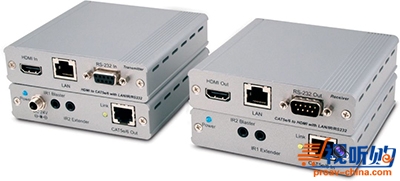 接收器输出口 1×HDMI 影音端子,1× 网络端子 (RJ45 接头 ),1× 红外线发射器,1×RS-232 控制端子(D-sub 9-pin 接头 )