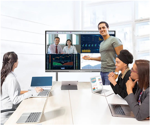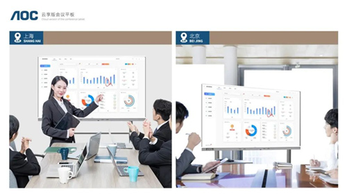 不管是与总部或公司其它分隔各地的部门人员,又或是与距离较远的客户进行事务沟通,在线远程视频会议无疑是极佳的解决方案。借助AOC智能会议平板进行多方在线视频会议,可以有效跨越空间,告别差旅奔波,使异地轻松交流,并提高沟通效率。最主要的是,在召开线上视频会议时,分别处于不同场景下的多台会议平板,可以有效进行云白板共享与互联,进而实现更高效的会议协作。