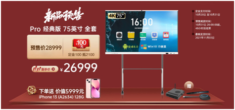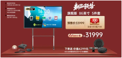 双十一期间预售选召有礼,购买T33K系列经典版Pro、T32F系列旗舰版智能会议平板最高可享“定金100元抵2100元”,更有iPhone 13、华为MatePad 11、AOC全向麦克风、4K摄像头等好礼相送!福利多多,惊喜重重,不容错过!