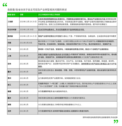 地方两会总体延续了中央经济工作会议的主基调,产业布局围绕‚十四五‛规划展开,加强了对“网络强国、数字中国”的重视度,将推动互联网、大数据、人工智能等同各产业深度融合,推进数字产业化和产业数字化,加大重要产品和关键核心技术攻关力度。