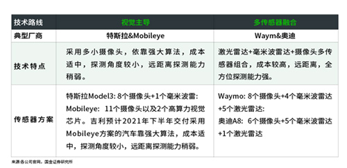 顺便做个拓展,当前行业内主流研发和应用的自动驾驶汽车传感器为车载摄像头、超声波雷达、毫米波雷达、激光雷达等,不同的组合形成了以视觉主导(摄像头+毫米波雷达+视觉芯片)和以多传感器融合(激光雷达+毫米波雷达+摄像头)为主导两种路径。