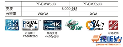 紧凑轻巧的PT-BMW50C系列液晶激光投影机,机身仅重7.2kg,亮度高达5,000流明。1.6倍变焦镜头设计和垂直/水平镜头位移功能,可让投影机在有限空间内灵活安装,并可将投影画面调整至理想形状。PT-BMW50C投影机支持DIGITAL LINK和4K信号输入,简化了系统集成。采用SOLID SHINE激光光源技术,光源更换周期长达20,000小时,画面可长时间保持亮丽的色彩。PT-BMW50C系列着眼于未来,是您明智的投资之选。