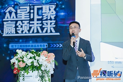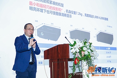 随后由松下公司营业课长王桐先生为各位来宾介绍本次发布会的松下工程投影机新品。万众期待的50,000lm高亮度激光投影机PT-SRQ50KC作为本次发布会主屏幕的投影设备,7.1m×4m巨幅影像所具有的细腻画质与真实色彩让所有嘉宾感到惊艳。该投影机采用新型红蓝双色激光技术的SOLID SHINE双驱动激光荧光轮系统,高亮度的基础上实现4K分辨率,会场明亮的环境下投射画面清晰自然、不刺眼,白色画面成像干净,在如此敞亮的会场仍可轻松观看。多重保护功能确保重要应用下的可靠运行。全新智能设备远程操控系统及360度安装功能使前期安装轻松进行。PT-SRQ50KC是一款具有一体化机身设计的投影机,几乎同30,000lm激光工程投影机同等大小的紧凑机身,卓越的散热效果及会场全程近乎无声的分贝,使在场客人沉浸在精彩的演讲中。