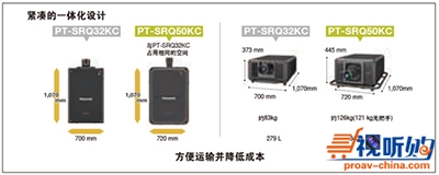 PT-SRQ50KC作为50,000流明投影机,却仅有松下30,000流明投影机的体积大小,大大提高了机器安装的灵活性及空间设计的问题,方便运输并降低成本。