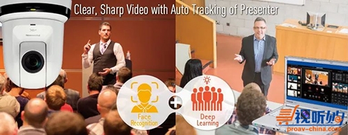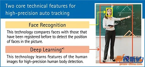 摄像机采用高精度人脸识别和高性能人体检测。不管人物面对的方向如何,都可以进行跟踪,因此即使在目标人物转过身在书写板上写字时,摄像机也可以在该环境中不间断地捕获人物。人体检测功能使用了深度学习技术,该技术可以从成千上万的人体图像中进行累积和学习,即使在可见性较差的环境(例如黑暗的房间)中也可以实现高精度的检测。