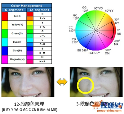 SQ1C系列特有12段颜色管理,相较于3色段颜色管理,可以更细腻区分需要调整的颜色,使被调整的颜色,色彩还原更加准确,且不会影响白平衡的变化,更易调整颜色达到画面的理想颜色显示效果。