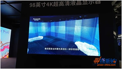 松下展位接待区左侧的98英寸4K超高清工业液晶显示器——TH-98SQ12MC,用于松下投影机案例及奥运宣传展示。