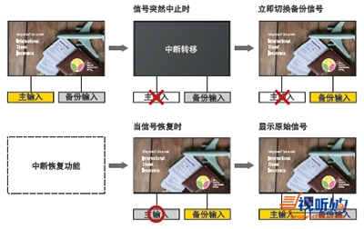 当屏幕显示主信号源被干扰时,中断转移和中断恢复功能可以防止信号中断,系统将立即切换至备份信号输入。当主信号源恢复后,原始影像将被显示。搭载中断转移和中断恢复功能,防止信号中断。