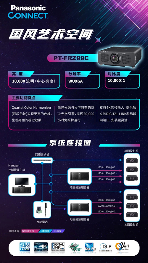 6台10,000流明的松下PT-FRZ99C工程投影机在墙面和地面上用光影氤氲成一幅素雅的丹青水墨画。松下PT-FRZ99C工程投影机的四段色轮和单芯片DLP成像技术,带来卓越的画面表现力,在层层光影里,浅墨清韵,淡彩晕染,碧水浮舟,意境深远。