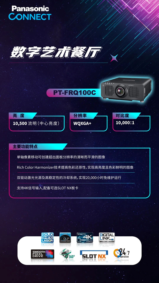 一台松下PT-FRQ100C搭配雷达技术打造的“数字艺术餐桌”,虽没有真实的美食摆放在桌上,但是,色彩丰富的“数字艺术餐桌”却给观众带来更多浪漫和想象,带给了观众从未有过的“就餐”新奇体验。