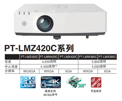 精巧的光学设计使PT-LMZ420C系列成为更紧凑、更轻便的液晶激光长焦投影机。机身仅重4.2Kg,可实现最高4,400流明中心亮度。3,000,000:1的高对比度、逼真的色彩还原和强光感应功能,即使在户外、教室和办公室明亮的环境下,也可确保图像清晰可见。