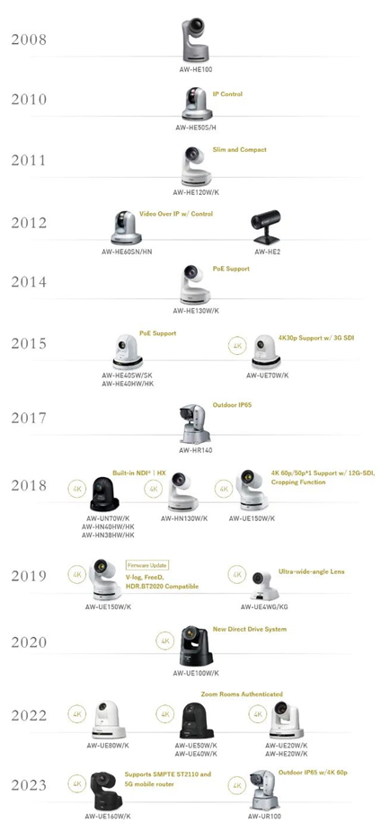 从IP控制、POE供电、到ST2110 4K JPEG XS, 从单臂机身、直驱电机、到UR户外,从标清、高清、4K 60p、到高速拍摄……松下一体化摄像机不断推陈出新,在确保广播级画质、产品细节品质、安全稳定运行基础之上,引领业内技术应用不断向前发展。