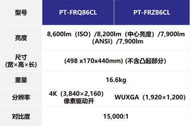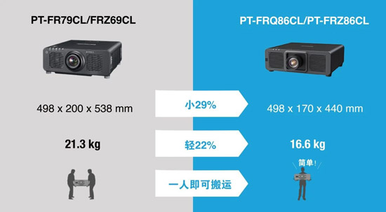 松下PT-FRQ86CL系列较前代产品体积降低29%,重量降低22%,亮度输出提高39%。