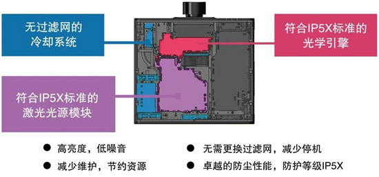 应用IP5X防尘等级的光学引擎和激光光源模块,并通过松下专有标准的粉尘环境测试,设备无需安装空气滤网,可在多尘的环境下运行长达20,000小时,免于设备的频繁维护。