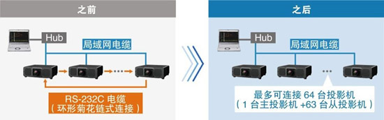 可通过局域网,实现多台设备的对比度和快门同步功能,大画面浑然一体。当开始播放和结束播放时,多台开闭一致,带有淡入淡出效果,并且支持单独的快门关闭/开启操作。