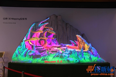在楼体投影的一侧是由科视D4K40-RGB真激光投影机播映,赢康独立策划片源的山体3D投影秀,凹凸不平的山体上,画面经过调试之后与山体模型完美契合,呈现了一场精美震撼的投影演出。