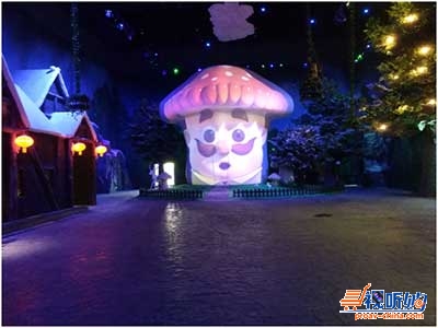 电影乐园入口,中庭的“大蘑菇”创意投影吸引眼球,萌萌的造型,可爱的卡通形象投影,这样的异形投影最考验的就是技术设计和调试功底,科视投影机和7thSense无损媒体播放器的搭配完美地解决这一难题。