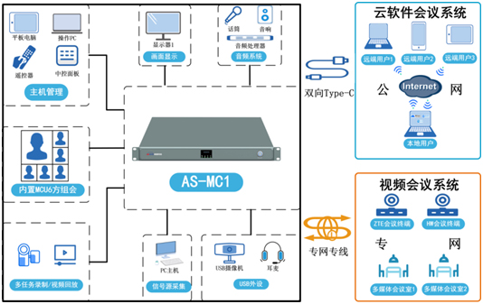 AS-MC1云会议综合管理主机,是一款针对中小型会议室设计的产品,主机集4K视频矩阵,中控,SIP/H.323视频会议和MCU,录播,可视化管理于一体。主机除对会议室音视频进行可视化管理外,同时还具备与第三方视频会议或MCU互联互通的能力,如华为,中兴,Polycom等厂家的视频会议产品。通过使用双向音视频的TYPE-C接口线,即可实现将音频,视频信号接入至安装云视频会议软件的会议屏,计算机等设备,兼容云视频会议软件包含有ZOOM、腾讯会议、钉钉云,Skype等。AS-MC1是一款实现会议室管理,云会议,专网视频会议无缝融合的产品。