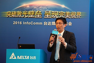 【专业视听网报道】:4月13日,全球视讯显控领导者——台达于InfoComm China 2016首日,以“突破激光壁垒·呈现完美视界”为主题,成功举办媒体交流会。交流会现场,来自各行业的近四十家媒体齐聚一堂。台达视讯以具体实绩,传达在视讯显像领域的布局与最新产品方案,并分享了集团未来战略。台达集团-中达电通董事总经理游文人、台达视讯事业部资深处长华健豪等公司高层出席了本次交流会。