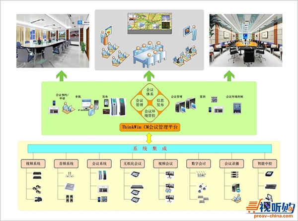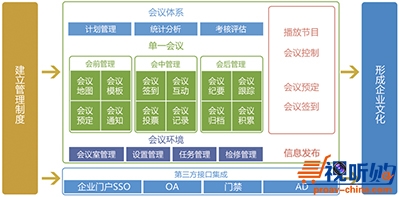 如何提高会议的效率和效果是人们一直想解决的问题。随着技术的进步,人们从单一功能的角度开发了一系列解决会议问题的系统:从视觉的角度,开发了显示系统、投影系统;从听觉的角度,开发了拾音系统、音响系统;从信息发布的角度,开发了会议信息发布系统;从会前管理的角度,开发了会议预定系统;从会中管理的角度,开发了针对签到的会议签到系统、针对文件分发的无纸化系统、针对会议讨论的手拉手数字会讨系统;针对远程会议开发了电话会议系统、视频会议系统;针对会议场景留存,开发了会议录播系统等等。这些系统之间彼此独立,信息不能共享,成为一个个系统孤岛。