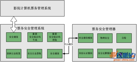 在本方案中,现有电影院计算机票务管理系统与票务安全管理系统模块进行对接,票务安全管理系统通过局域网与票务安全管理器进行安全通信,票务安全管理器物理上独立的硬件设备。系统结构如图1所示。