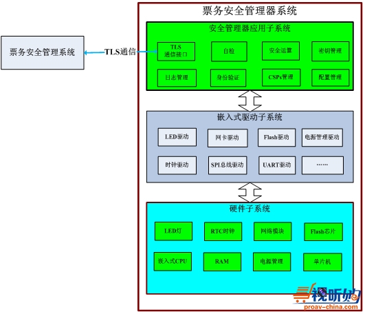票务安全管理器模块涉及到硬件系统和软件系统两个方面,硬件系统部分的主体设计为一块PCB板卡,板卡中采用嵌入式CPU芯片运行嵌入式操作系统环境;软件部分包括嵌入式环境的基本结构和安全系统应用软件,并运行在嵌入式操作系统环境中。票务安全管理器对外提供相应的SDK开发包,对票务安全管理系统进行系统集成开发,为票务安全管理系统提供信息安全相关功能服务。