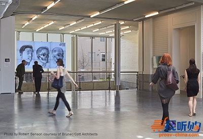【专业视听网报道】:美国马萨诸塞州剑桥兰德艺术中心玻璃艺术墙前面中心位置由42英寸显示屏组成了3×3的视频墙,由RGB Spectrum Galileo显示处理器为这组视频墙提供动力。学生、老师和路人不论是白天还是黑夜都可以透过玻璃窗看到大楼里面的视频墙,视频墙播放来自莱斯大学艺术设计学院的艺术作品。