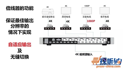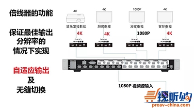 DUX系列8×8矩阵及其倍线器,可在中小型办公空间与豪宅中,轻松实现多视频源与多显示设备间的自由切换。倍线器与带倍线功能的延长器保证了输出分辨率最大的前提下,在输出端自动适应不同显示设备的最佳分辨率输出,并能在信号源音切换时实现无黑屏、无闪烁的无缝切换。