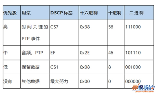 下表显示了Dante如何使用各种Diffserv Code Points(DSCP)数据包优先级值: