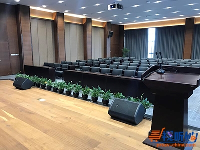会议厅扩声系统选用美国JBL PRX800W新一代有源智能扬声器系统。其中使用了PRX 812W有源12寸两分频作为舞台监听以及侧补音。PRX815W有源15寸两分频作为主扩声。JBL全新推出的PRX800全系列产品都拥有1500W高输出动力,并且内置D类功放,结合JBL专利技术,能够实现最高的效能,还能实现WiFi无线控制,拥有操控自如的特点,最终赢得了业主的青睐。
