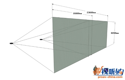 说明:方案推荐选用12000流明丽讯RU81913投影机,2台横向融合,融合带为单台投影画面的20%,配置一块2360厘米x820厘米的投影屏幕,单台投影画面约609寸,全屏分辨率3456×1200,画面像素点约6.8毫米。屏前亮度112Lux(环境光照度要求控制小于37Lux),配置投射比1.73-2.27:1镜头,投影机安装距离屏幕2270.2厘米-2977.8厘米范围以内。要求布置DVI-D(24+1)光纤信号线缆及超五类控制网线,国标2.5平方电缆,标准三插并正确接地线。