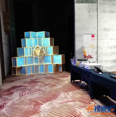 展项特点:由20个BOX做为成像介质,实现画面同步;现场演示了极具MAPPING挑战的BOX投影秀,精准地演绎了立体影像体验空间。VIVITEK投影机不仅可实现普通的平面成像,也可以在不规则的成像介质上进行精彩画面呈现。展项实现方式:1台VIVITEK 投影在定制的视频内容通过视频服务器实时精准的渲染在20个BOX上面。画面尺寸:宽3.2米,高2.5米。适用环境:展项延伸可应用于外墙MAPPING投影、舞台表演、博物馆、展示馆等。3D Mapping投影技术作为一种新兴的新媒体技术,是全球先进的投影技术。 3D Mapping投影可以作用在任何介质上,打破物理空间,让物体表面转变成动画,实现物体与动画的完美融合, 产生强烈的视觉冲击力。