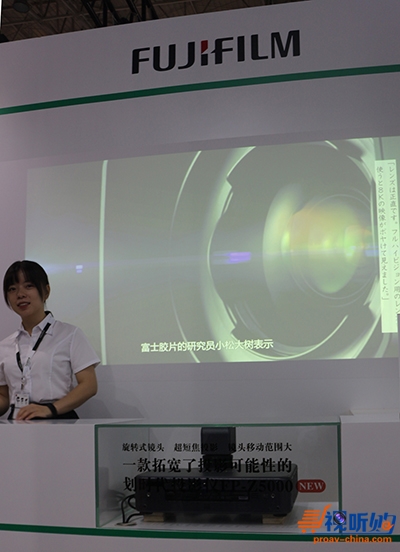 展会现场富士胶片也通过各种演示来充分展示其特性,如:不移动机体,只旋转镜头从而实现多角度投影、以及在受限空间中,简单调整投影图像上下左右的位置即可轻松实现投影。