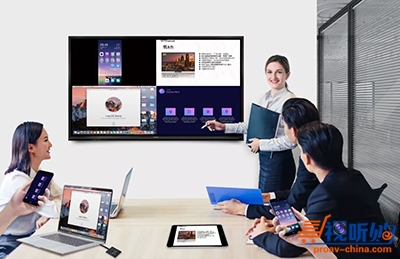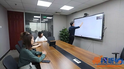 在远程视频会议中,具有摄像头及麦克风的整体方案可以快速开启“面对面”交流;通过桌面上的专业控制屏,组织者可以对视频会议设备进行集中管控,包括一键入会、调整摄像头方向或一键静音等。与会者可以直接进行无线投屏显示,并应用交互白板的书写、擦除等功能。