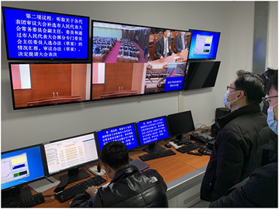现场所有会议模式完全实现软件控制,议题进程,政府工作报告,两院报告全程同步显示,会场视频信号无缝切换,完美显示。