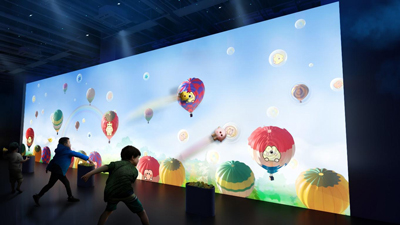 主要用多台投影融合加上墙面互动系统打造出一块超大屏,孩子们可以通过用道具砸墙引起墙面大屏显示的反馈,给与孩童们不一样的体验乐趣