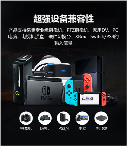 考虑到信号源设备的多样性,美乐威USB系列视频采集棒设计之初就非常考究对信源的兼容性,最终实现对不同设备输出信号的广泛兼容,包括单反相机、专业相机、硬件切换台和游戏主机等等。此外,还支持特殊分辨率和高帧率信号采集,例如USB采集棒4K版本即支持采集游戏主机输出的2560x1440p 144fps视频信号,帮助拓展用户的应用场景。
