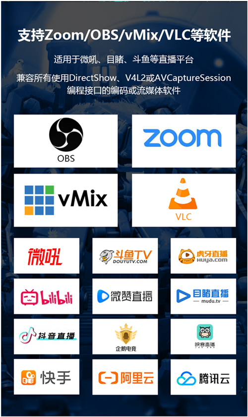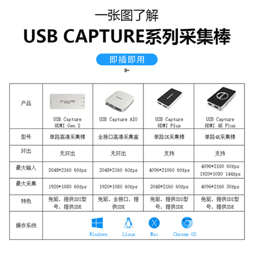 美乐威USB系列视频采集棒注重应用的简易型,不需要手动安装驱动,连接信号源和主机就能工作。不同用户会使用不同的主机,包括不同型号的笔记本及台式机,美乐威USB采集棒经过历年市场的检验和打磨,通过标准USB 3.0接口就能采集高清或4K音视频信号,帮助用户用最简单可靠的方式将SDI、HDMI、DVI信号采集到常用的Windows、Mac、Linux或Chrome OS系统的直播软件中。