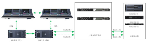 主调音台、备调音台、音频接口箱采用星型技术的冗余网络架构,每台设备都连接到中央交换机。中央交换机包括主、备2个冗余网络环路,分别由主、备两台Yamaha SWP1-8MMF交换机组成,两台交换机相互独立工作。网络正常工作在主环路上,当主环路出现故障,备链路会自动接管连接。保证音频系统安全、稳定工作。日后如需扩展接口数量,只需增购接口箱连接到中央交换机。每套RIVAGE PM5数字混音系统均内置64通道Dugan自动混音器,DaNSe噪音抑制器,RTA实时频谱分析等50种效果功能。满足各种节目制作要求。