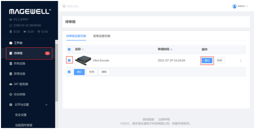3. 返回Magewell Cloud的Web界面,在“待审核”页签中,勾选刚才申请注册到云平台的编码盒,再点击“通过”。