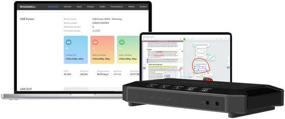 同时,USB Fusion还提供Web UI演示制作方式,除了支持画面切换合成,画面处理,音量调节,以及创建多个演示稿等操作。还可以帮助技术维护人员对设备进行状态信息查询、媒体文件管理、固件升级和维护等功能。