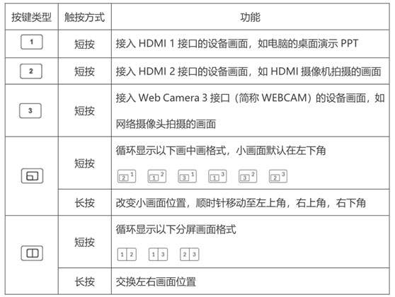 USB Fusion设备面板上具备5个实体按键,允许用户在全屏信号源和组合场景之间切换。此类方式非常适合只需画面简单切换和组合的用户,用户通过实体按键即可完成操作,简单易行。