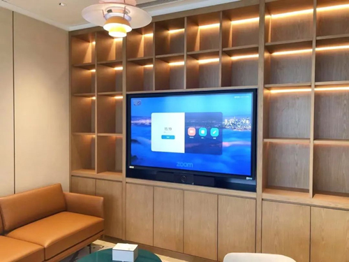 弘毅大会议室功能定位为高规格的超大VIP会议室,通常用于召开企业董事会议,会议室内的显示配置86寸互动一体双显示屏运行软视频会议Zoom Rooms,远程视频会议使用双显示屏模式,内容双流画面和远程视频图像可分开显示,保证显示内容最大化。同时也可实现手动或设定时间控制雾化玻璃、灯光、窗帘、显示设备开启或关闭。