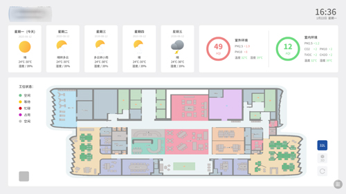 可实时发布天气预报、室内外环境情况、时间日期、工位状态等相关信息。