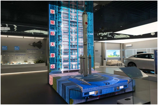从汽灯纱罩、打火石到新能源汽车、航天科技,稀土在传统、战略新兴、绿色低碳领域里都有不少成功的应用。来到稀土与应用区域,LED直角拼接屏真实地还原火箭升空场景,完美地诠释了稀土与稀土产业助力中国航天事业发展的重要作用。