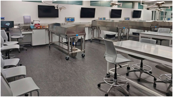 集成领先 AV 技术的 SET 五层教学大楼内设有科学、技术、工程及数学类院系的多个教学场所。它们均按需部署 AV 设备,从单屏教室到多屏大型报告厅,再到有多个解剖台的解剖实验室 (每个解剖台都配备摄像机和显示器,方便小组观摩,无需挤在解剖台周围)。