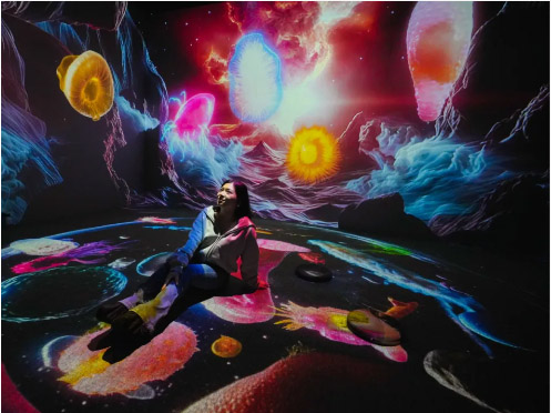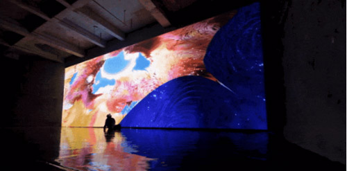 该作品创作灵感来源于泰戈尔的飞鸟集,“生如夏花般绚烂”被转译成视觉语言,各色粒子无序地翻涌和汇聚,松下PT-FRQ100CL工程投影机在墙面铺设层层热烈而生动的色彩,投影机的Rich Color Harmonizer技术对光源输出中的比例进行持续调整,实现超过预期的鲜明显示。