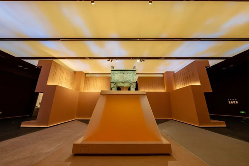 殷墟博物馆新馆建筑呈现鼎形,矗立在水中央,古铜色的大门上方是甲骨文字大邑商三个字。在展览布局方面,新馆聚焦“伟大的商文明”这一主题,设有3个基本陈列、4个专题展览和1个特色沉浸式数字展,展出青铜器、陶器、玉器、甲骨等文物近 4000 件(套),展陈文物数量庞大、类型多样,其中四分之三以上的珍贵文物属于首次亮相。
